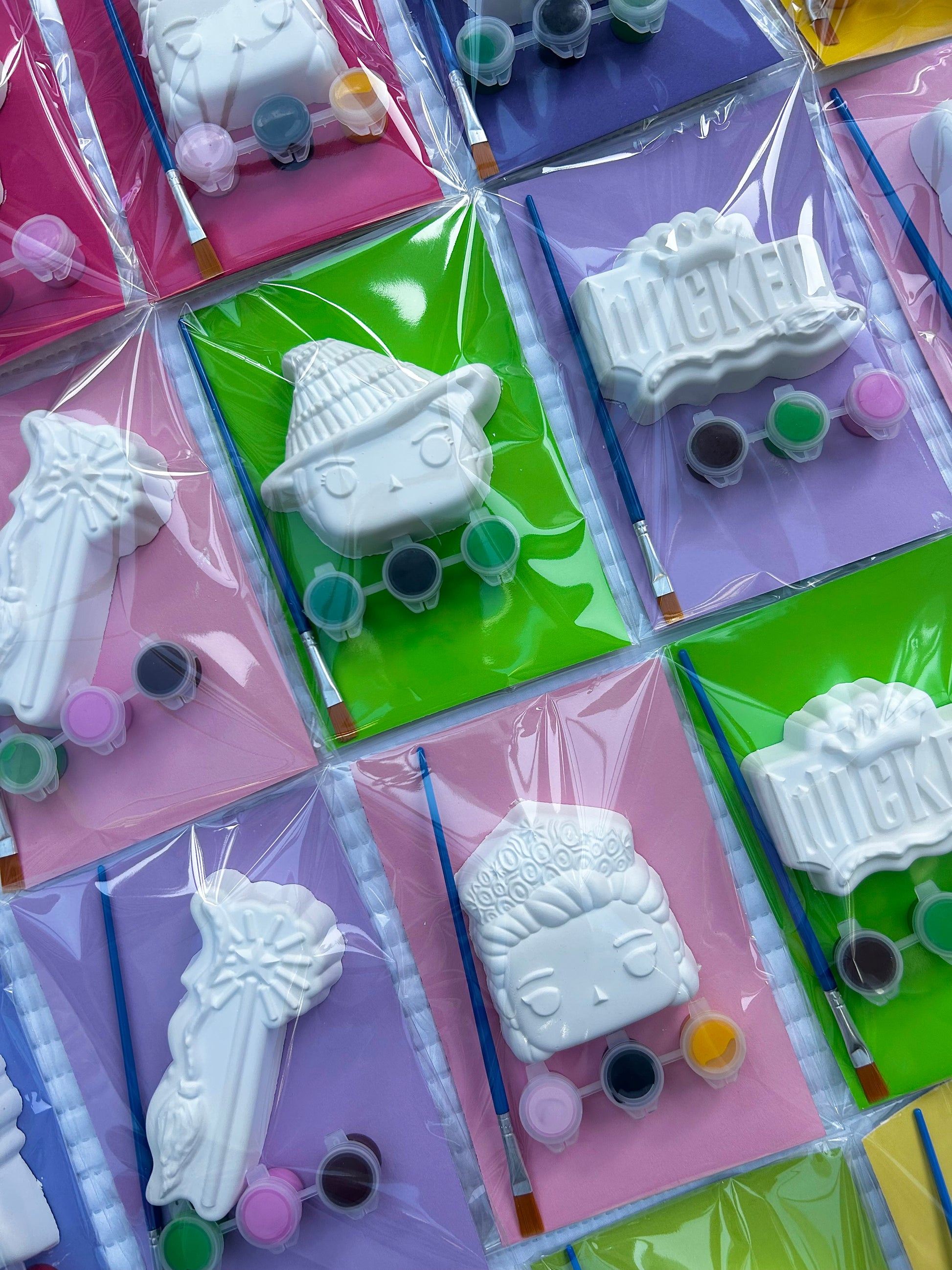 Each packed in a clear cello bag with coloured card backing to paint onto for less mess.